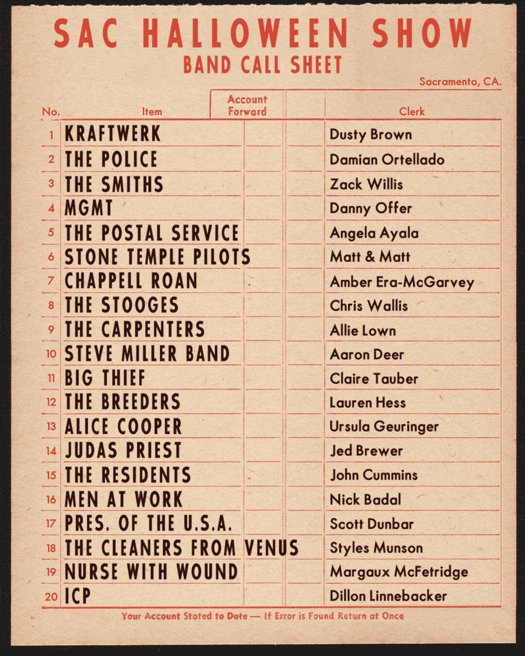 BUSH / BUZZCOCKS / CAPTAIN BEEFHEART / DICK DALE / HAIR / HOLE / KNEECAP / MOTORHEAD / RADIOHEAD / SMASH MOUTH / HEART / SOFT CELL / SPINAL TAP / STIFF LITTLE FINGERS / TALKING HEADS / THE FACES / THE SLITS / THIRD EYE BLIND / TOM PETTY AND THE HEARTBREAKERS / WILLIE NELSON / WINGS